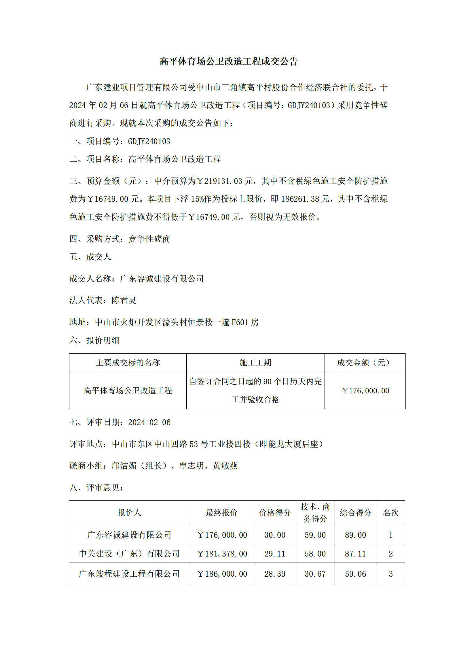 高平體育場(chǎng)公衛(wèi)改造工程成交公告
